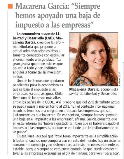 Macarena García en El Mercurio: «Siempre hemos apoyado una baja de impuesto a las empresas»