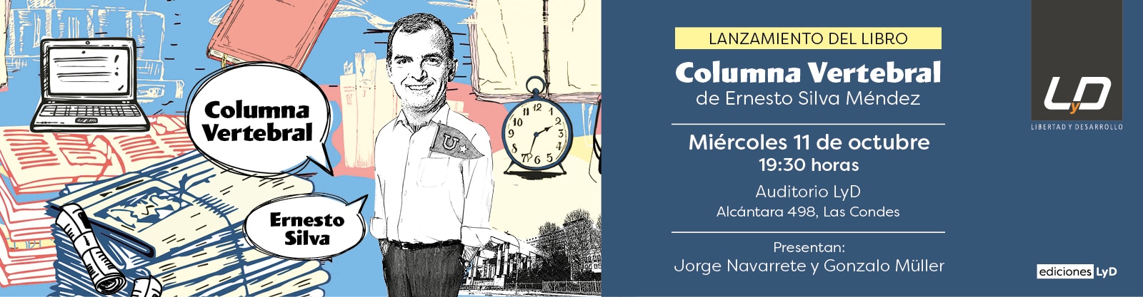 Tenemos el agrado de invitarlos a la presentación del nuevo libro del diputado Ernesto Silva Méndez, "Columna Vertebral", editado por Ediciones LyD. El lanzamiento se realizará el día miércoles 11 de octubre, a las 19:30 horas, en el Auditorio LyD, ubicado en Alcántara 498, Las Condes.