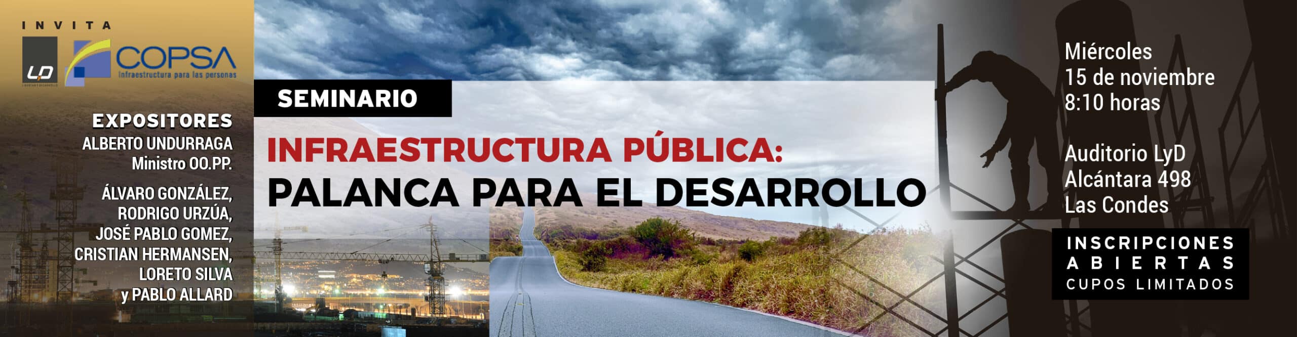 Expondrán en este seminario el Ministro de Obras Públicas, Alberto Undurraga; Álvaro González, de Ikons, CPI; Rodrigo Urzúa, Jefe de la División de Proyectos de la Coordinación de Concesiones del Ministerio de Obras Públicas; José Pablo Gomez, Jefe de la División de Finanzas Públicas de la Dirección de Presupuestos, Ministerio de Hacienda; Cristian Hermansen, Presidente del Colegio de Ingenieros de Chile; Loreto Silva, ex Ministra de Obras Públicas; y Pablo Allard, Decano de la Facultad de Arquitectura y Arte de la Universidad del Desarrollo.