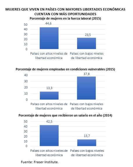 El estudio Impact of Economic Freedom and Women´s Well-Being del Instituto Fraser de Canadá, muestra que las mujeres que viven en países con mayores niveles de libertad económica cuentan con más y mejores oportunidades económicas, niveles más altos de educación y salud y mayor independencia financiera en comparación con mujeres que viven en países con menores niveles de libertad económica.