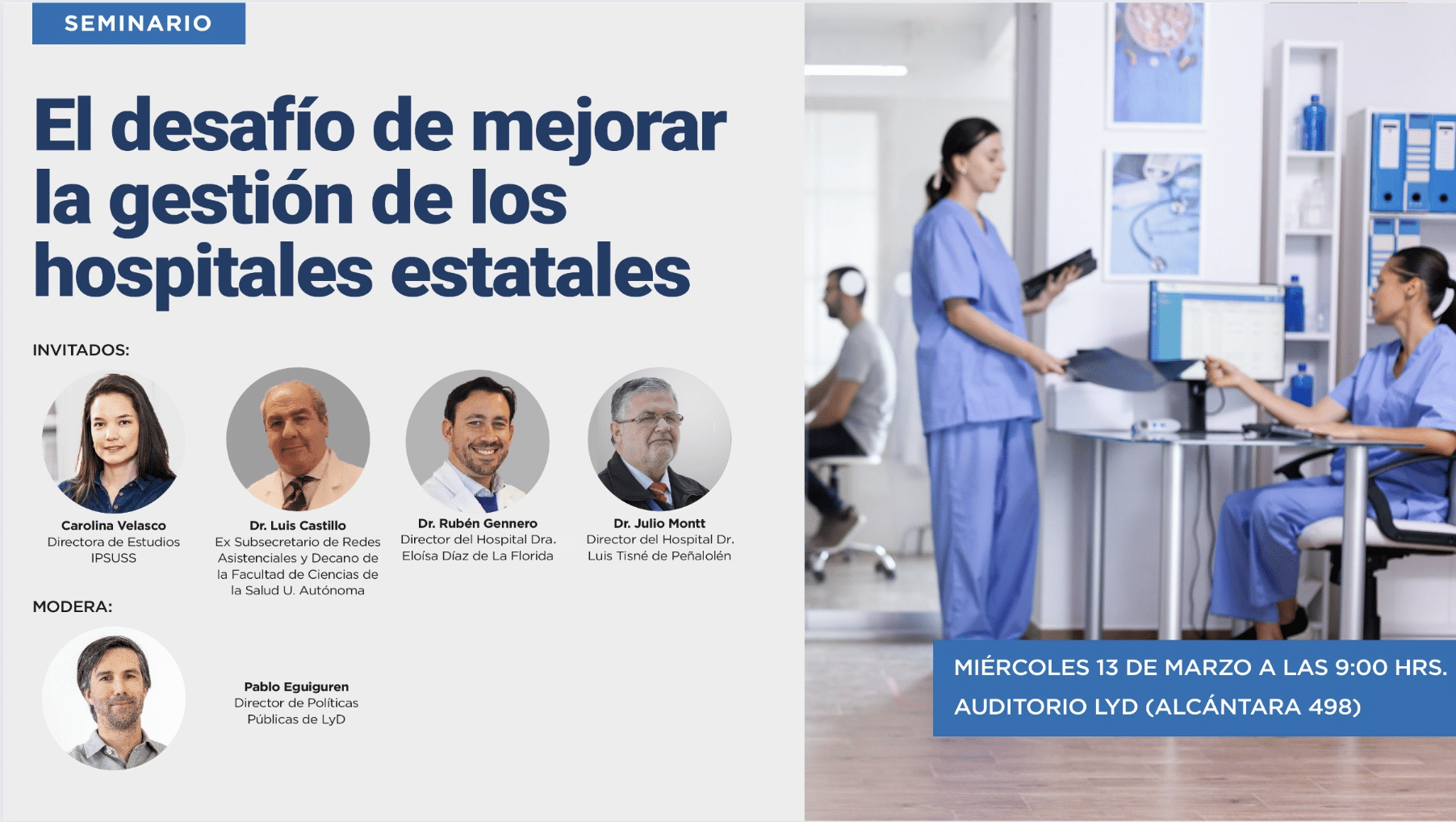 Mientras en el Congreso se seguirá debatiendo la Ley Corta de Isapres, el año 2023 cerró con un récord en el número de personas que esperan por una atención en salud. Para ver cuáles son los obstáculos que impiden mejorar la oportunidad en la salud estatal, te invitamos al seminario "El desafío de mejorar la gestión de los hospitales estatales" el miércoles 13 de marzo a las 9:00 horas. En esta oportunidad, dos miembros del Comité Técnico de Reforma del Sector Salud y dos directores de hospitales se referirán a cómo avanzar en productividad en los hospitales estatales.