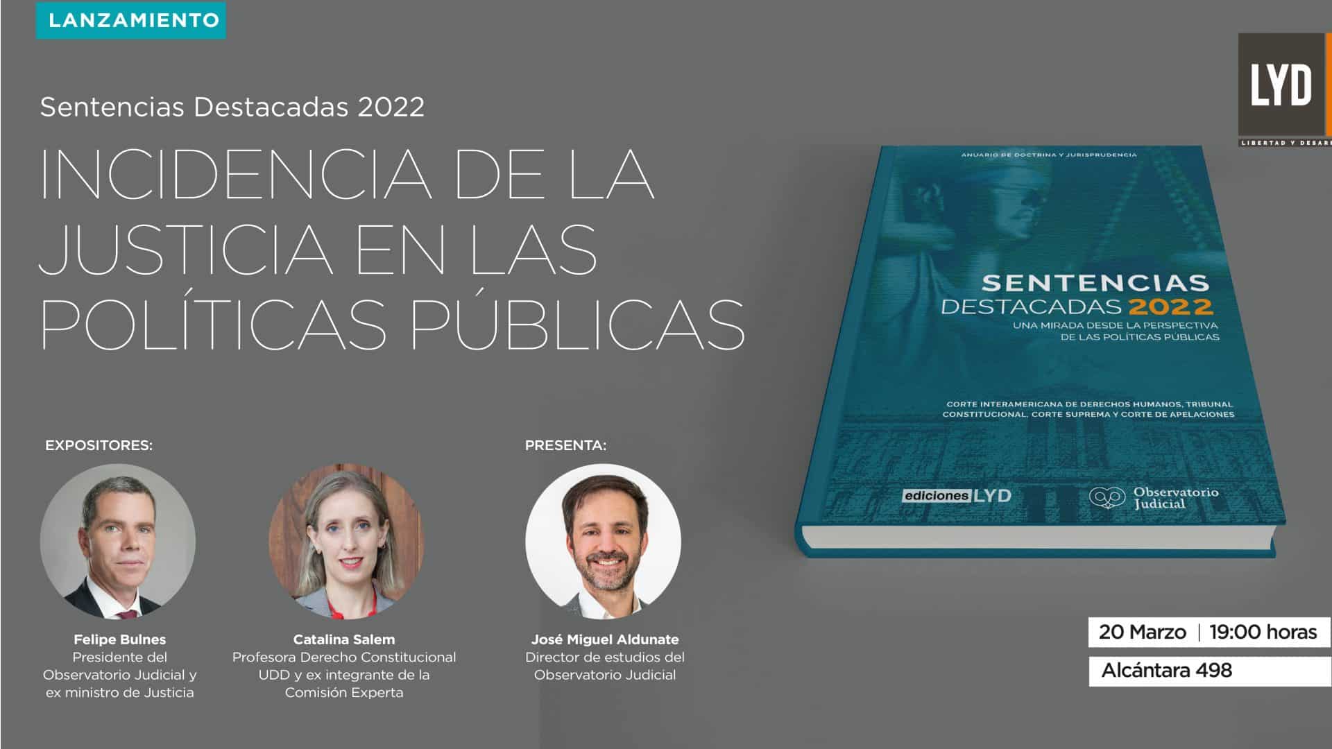 El miércoles 20 de marzo a las 19:00 realizaremos, junto con el Observatorio Judicial, la presentación de la XIX versión del anuario de doctrina y jurisprudencia “Sentencias Destacadas 2022” donde analizaremos la “Incidencia de la justicia en las políticas públicas".