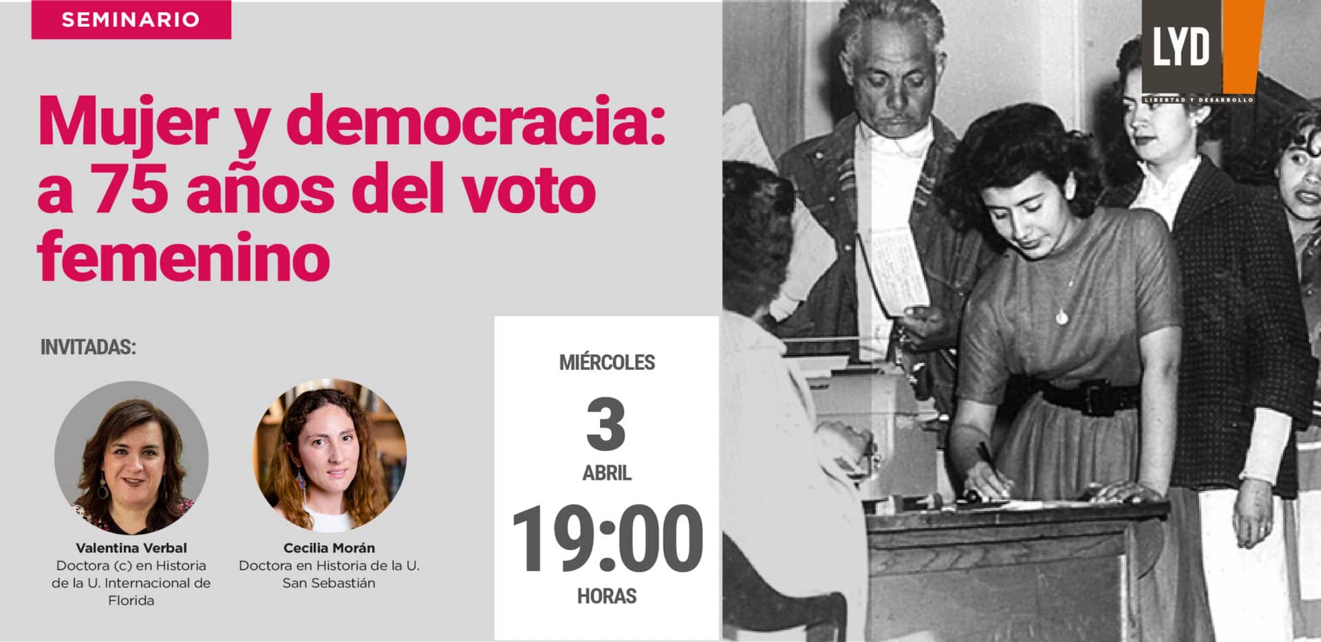 Te invitamos al seminario “Mujer y democracia: a 75 años del voto femenino”. En esta oportunidad, las historiadoras Valentina Verbal, especializada en historia de género y política, y Cecilia Moran, experta en participación política y representación de las mujeres, abordarán el rol de las mujeres en la democracia.