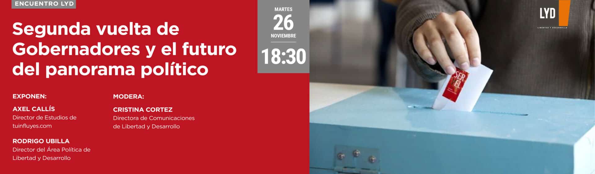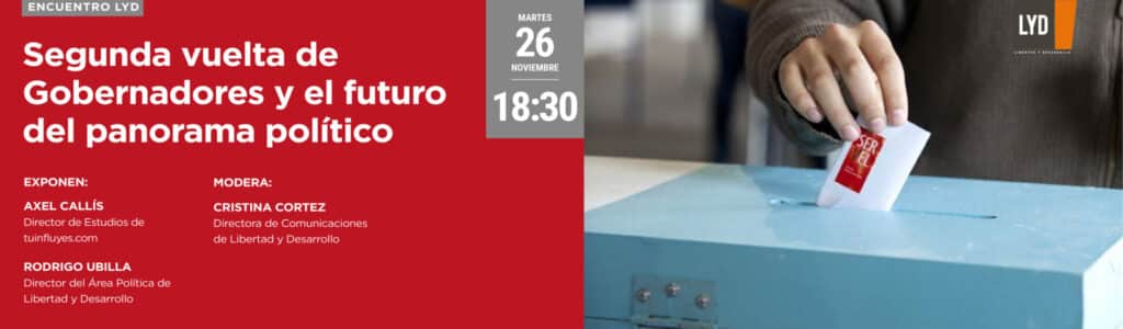 En Libertad y Desarrollo te invitamos a un encuentro con Axel Callís y Rodrigo Ubilla, en el que abordaremos los resultados de la segunda vuelta de gobernadores, analizando en profundidad cómo estos resultados impactan el panorama político hacia el futuro.