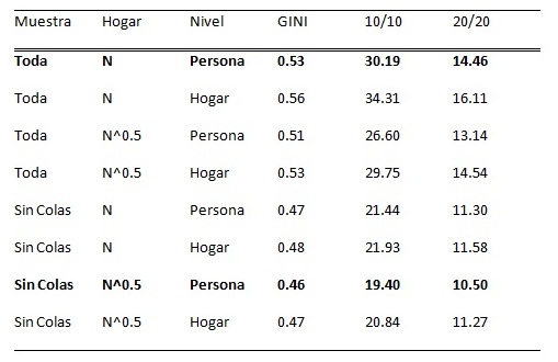 La primera fila sería la que coincide con los datos oficiales de Chile (toda la muestra, sin considerar economías de escala y a nivel de persona). Mientras que al excluir observaciones extremas, considerando economías de escala y midiendo a nivel de personas (en Europa se consideran estos ajustes), el Gini sería de 0.46.
