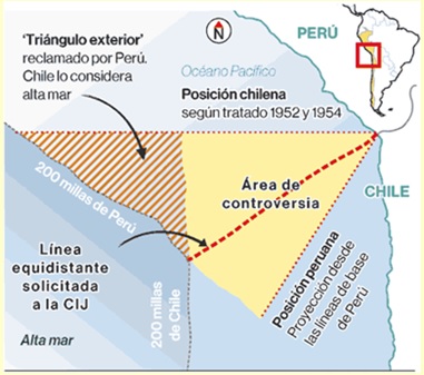 Perú consideraba que ninguno de los tratados firmados con nuestro país estableció los límites de las zonas marítimas. Chile, en cambio, sostenía que la frontera marítima había sido convenida por las declaraciones marítimas de soberanía y jurisdicción nacionales de 200 millas, por la Convención de Santiago de 1952 sobre Zona Marítima; por la Convención de Lima de 1954 sobre Zona Especial Fronteriza, por las Actas de las comisiones mixtas de límites de Chile y Perú de los años 1930, 1968 y 1969; y por los actos chilenos y reconocimientos peruanos a la observancia práctica de ese límite.