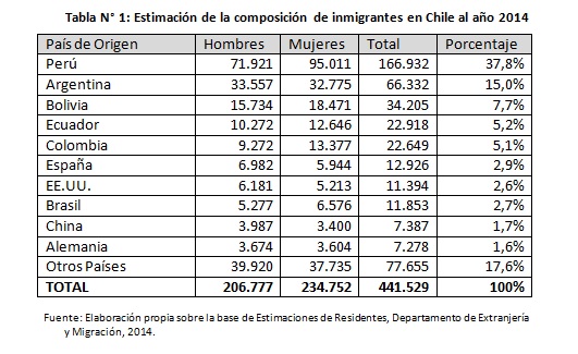 Según estimaciones del Departamento de Extranjería y Migración, en Chile habría 441.529 inmigrantes, que representan aproximadamente un 2,5% de la población total, por debajo del promedio mundial y menos de la mitad del porcentaje en países desarrollados. Todo indica que este porcentaje será creciente, tanto por la reunificación familiar de los inmigrantes como por el aumento de la renta per cápita y por la estabilidad política chilena con respecto a los países de países vecinos. Al respecto, según los datos del CENSO 2012, se mantiene la tendencia de las últimas décadas en cuanto a la procedencia latinoamericana de los inmigrantes (Ver Tabla N° 1), aunque se observa un creciente interés de colombianos y norteamericanos.