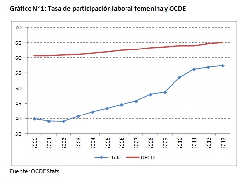 Es interesante ver que a pesar de que existe una brecha de participación laboral femenina de siete puntos respecto a la OCDE, ésta se redujo significativamente en el período 2010-2013, de alto crecimiento económico, quedando pendiente evaluar el impacto de políticas enfocadas al tema del cuidado de niños. Este avance en participación laboral femenina se moderó en 2013, coincidiendo con el menor ritmo de crecimiento. Llegar a la tasa de ocupación laboral femenina de la OECD significaría un total de alrededor de 500 mil mujeres más trabajando, lo que permitiría una clara mejoría de ingreso de su grupo familiar, además podría generar un aumento del PIB per cápita.