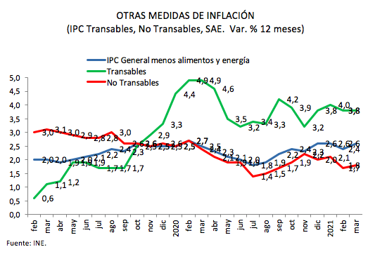 El índice de precios de los transables subió 0,3% en marzo, acumulando una variación anual de 3,8%, mientras que el de los no transables registró un alza mensual de 0,5%, alcanzando una variación a 12 meses de 1,8%. Finalmente, se observa que el IPC sin alimentos ni energía (IPCSAE) registró una variación mensual de 0,5%, alcanzando un total anual de 2,6%.