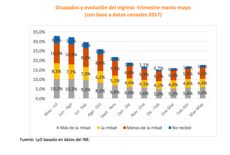 Desde el trimestre mayo-julio de 2020 en la encuesta de empleo del INE se incorporó una pregunta sobre la evolución de los ingresos para los ocupados. De esta forma, se observa que un 18% de los ocupados reportó una disminución en sus ingresos, levemente mayor a lo acontecido en el trimestre móvil anterior (17%). Adicionalmente sólo un 1,2% de los ocupados indicó que no recibió ingreso, levemente superior a lo reportado en el mes anterior (1,0%). En tanto, un 6,0% señala que sus ingresos cayeron a más de la mitad (5,6% en la medición anterior).