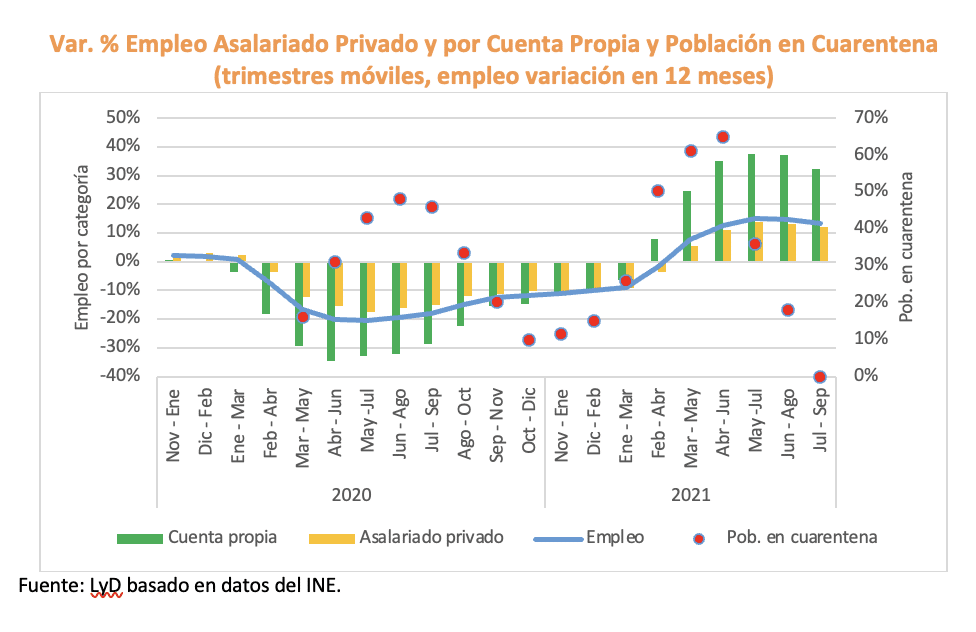 La disminución de la tasa de desempleo se explica principalmente por el relajamiento de las medidas sanitarias producto de la pandemia, dado que en el trimestre julio-septiembre hubo una fuerte caída de las cuarentenas. En julio, un 36% de las personas se encontraban confinadas, en agosto un 18% y en septiembre ninguna comuna del país se encontraba en Fase 1. Con todo, a pesar de observarse dicha mejora en los datos laborales, el aumento en el empleo se explica principalmente por el incremento en el empleo por cuenta propia. Es deseable que la cifra en empleo asalariado privado suba en mayor magnitud, potenciando la formalidad del mercado laboral.