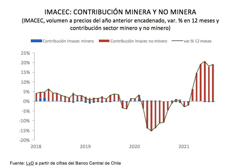 De esta manera, el sector minero contribuyó negativamente en 0,2% al IMACEC de agosto de 2021, mientras que la actividad no minera contribuyó en 18,9%, explicado por el buen desempeño en servicios y comercio.
