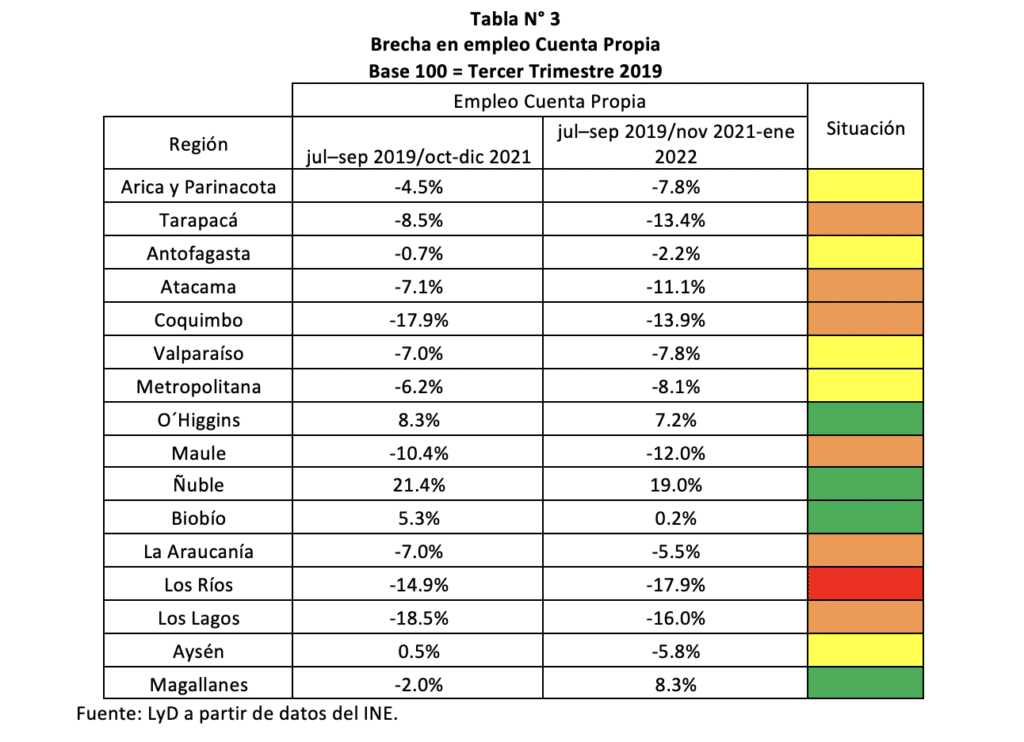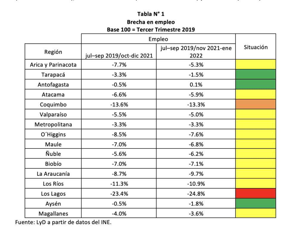 A nivel regional, a pesar de observarse avances en materia de empleo, aún persisten brechas importantes en algunas de ellas. Hay que destacar que Los Lagos sigue siendo la región más rezagada, lo que se debe principalmente a la reducción en la fuerza de trabajo que ha experimentado respecto a las demás. En esta misma línea, el cese de las medidas restrictivas producto de la pandemia genera una mejor perspectiva en materia de recuperación de puestos de trabajo