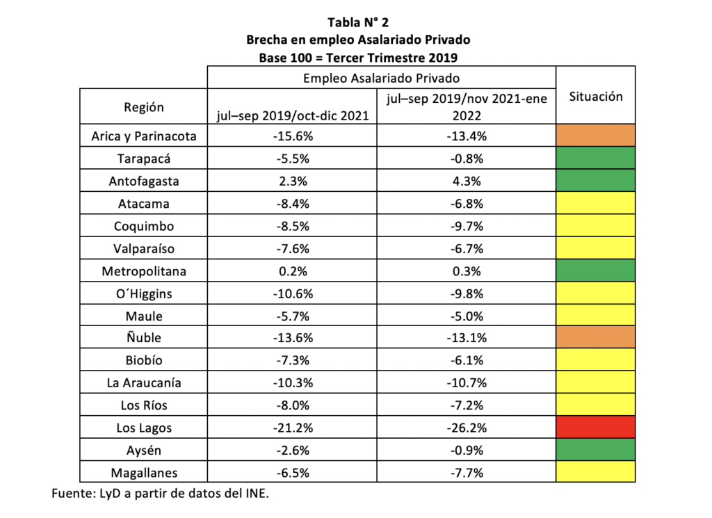 En 12 regiones del país se observan brechas con respecto a la línea base. En Tarapacá, Antofagasta, Aysén y la región Metropolitana, en cambio, hay una situación similar o mejor con respecto a la de la línea base. De esta forma, hubo una disminución de la brecha en empleo asalariado privado en 10 regiones y un aumento en 4.