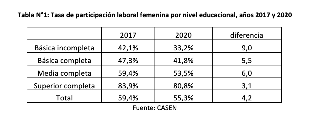 La participación laboral se correlaciona con el stock de capital humano. Así como en 2017 las mujeres que tenia sólo educación básica incompleta tenían una participación de 42,1%, dicha cifra cayó hasta 33,2% en 2020, lo que implica un retroceso de 9 puntos porcentuales. De hecho, tal como se observa en el siguiente cuadro, es la mayor caída en participación para todas las categorías educacionales.