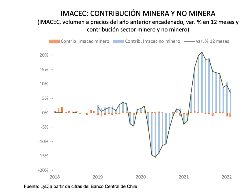 De esta manera, el sector minero contribuyó negativamente 1,5% al IMACEC de enero de 2022, mientras que la actividad no minera contribuyó 8,3%, explicado por el desempeño de los servicios.