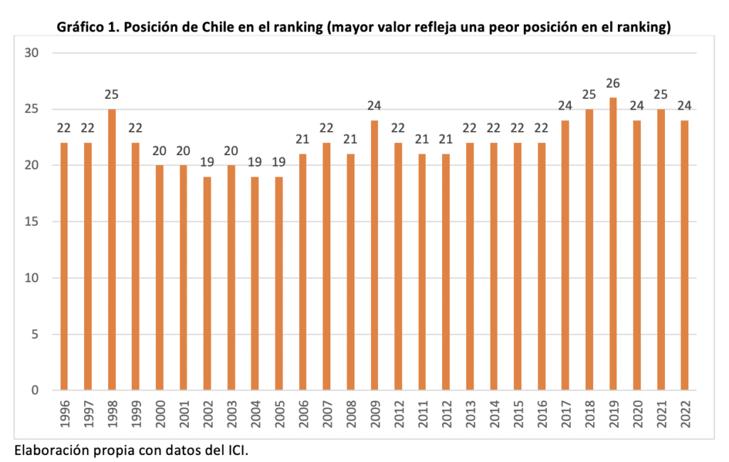 El índice, que pondera la posición relativa de los países en ocho índices de gran reputación mundial y que se elabora desde el año 2007, ubica a Chile en el puesto 24 de 183 países, lo que implica un avance de 1 puesto con respecto a la medición de 2021 -a pesar de que el informe destaca que la situación del país es preocupante-, pero 5 puntos lejos de su mejor posición alcanzada el año 2005 (con reconstrucción de datos).