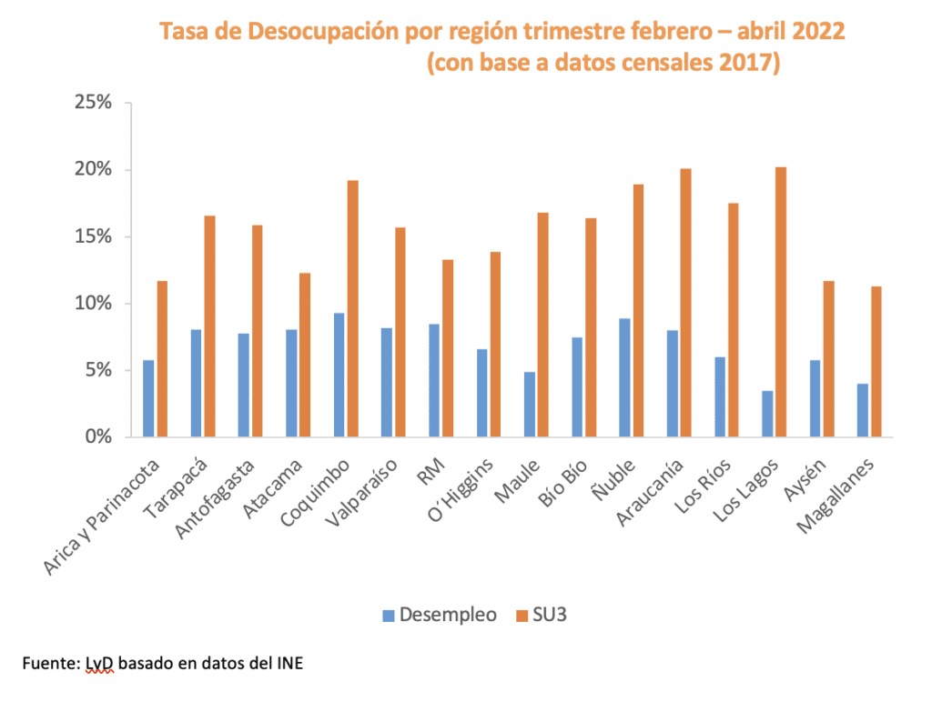 Coquimbo lidera la tasa de desempleo, con un registro de 9,3%, le sigue la Región de Ñuble con 8,9% y la Región Metropolitana con una tasa de 8,5%. En contraste, las regiones con menor tasa de desempleo fueron Los Lagos con 3,5% y Magallanes que registró 4,0%. La región de Los Lagos registra la mayor tasa combinada de desocupación y fuerza de trabajo potencial en este trimestre, anotando un 20,2%.