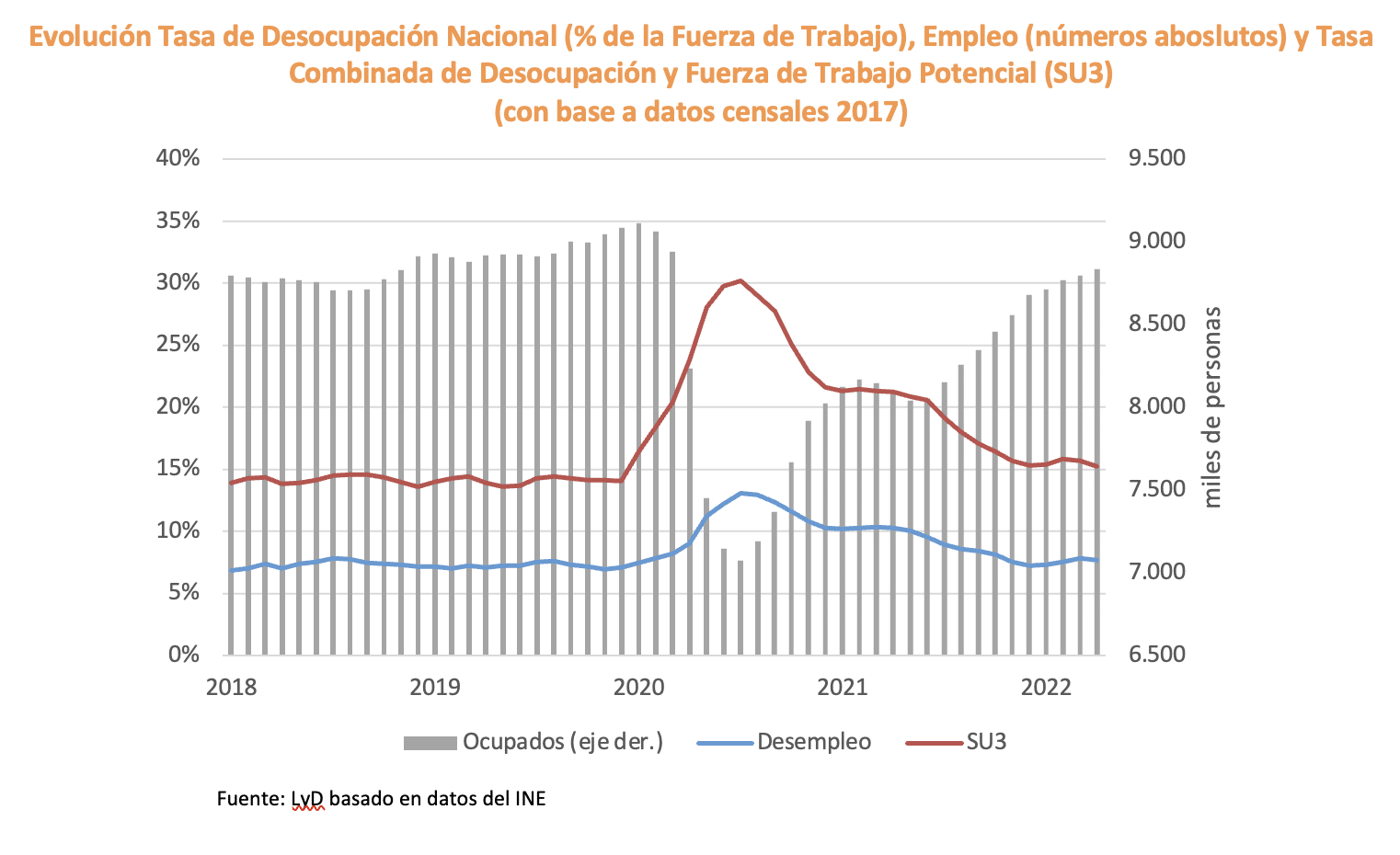 El Instituto Nacional de Estadísticas (INE) dio a conocer la tasa de desocupación nacional correspondiente al trimestre febrero - abril 2022, la cual se ubicó en 7,7%, 0,1 puntos porcentuales (pp) menor a lo registrado el trimestre móvil anterior. En doce meses, en tanto, se observa una caída de 2,5 puntos porcentuales. Adicionalmente, se registró una leve caída en la tasa combinada de desocupación y fuerza de trabajo potencial (SU3) con respecto al trimestre móvil anterior, la que se ubicó en 15,2%. Este indicador muestra la proporción de personas que están desocupadas y aquellos que son parte de la fuerza de trabajo potencial, todo esto respecto de la fuerza de trabajo ampliada.