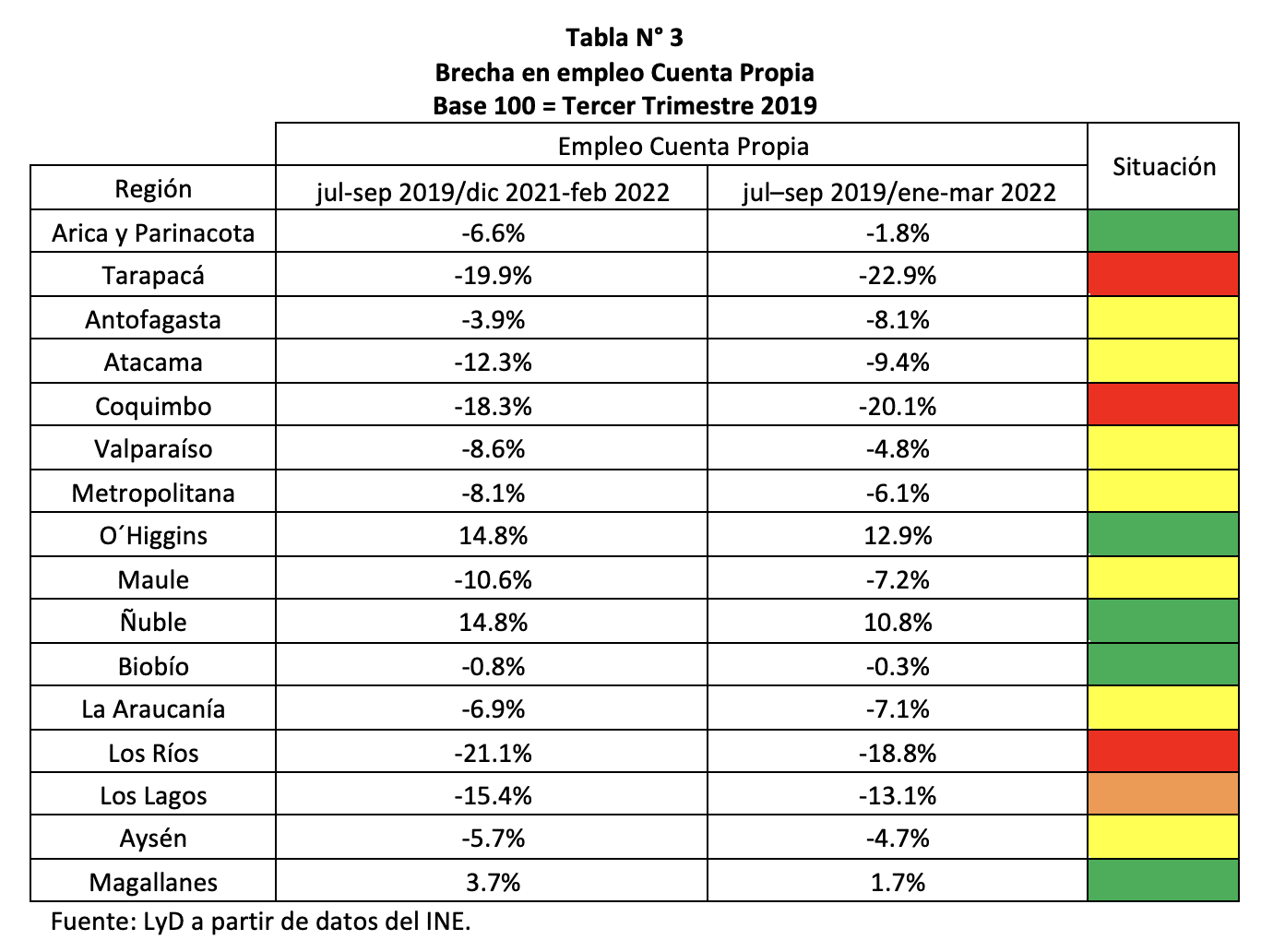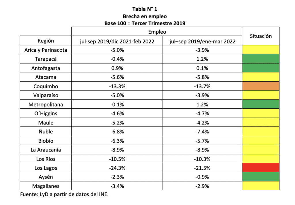 Con respecto a la medición anterior, en 8 regiones disminuye la brecha en empleo, en tanto que en 4 aumenta. En resumen, hay 1 región que se encuentra en color rojo (Situación Grave), 1 en color naranjo (Situación Intensiva), 10 en color amarillo (Situación Intermedia) y 4 en verde (De alta).