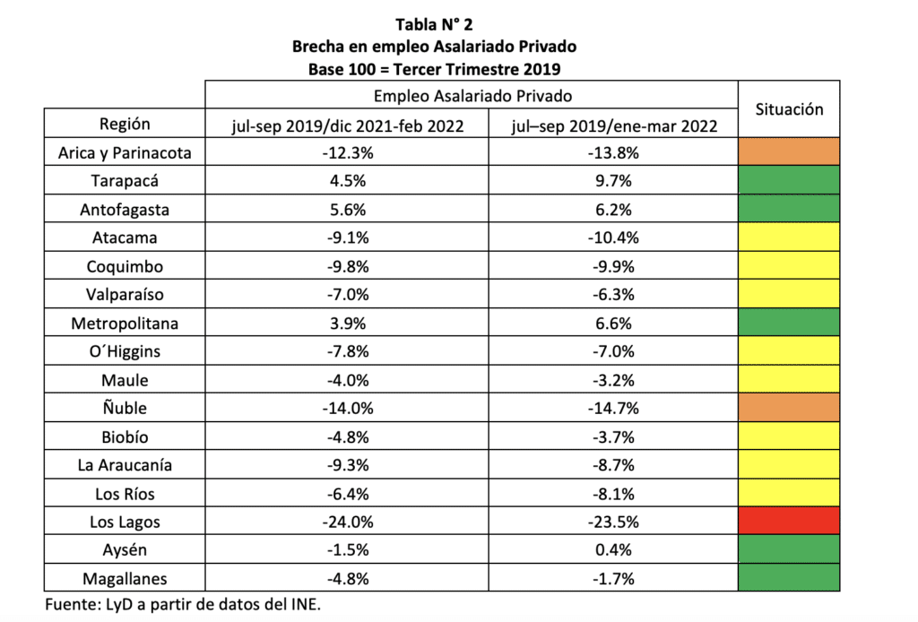 Es posible observar que en once regiones del país persisten brechas con respecto a la línea base. En cambio, en Tarapacá, Antofagasta, Aysén, Magallanes y la Región Metropolitana, se observa una similar o mejor situación con respecto a la de la línea base. Para este trimestre hubo una disminución de la brecha en empleo asalariado privado en siete regiones y un aumento en cinco. Las cuatro restantes se encontraban en situación de alta en ambos períodos.