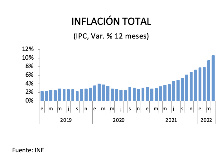 El Instituto Nacional de Estadísticas (INE) dio a conocer el Índice de Precios al Consumidor (IPC) para el mes de abril de 2022, el cual registró una variación mensual de 1,4%, acumulando 4,8% en lo que va del año. En doce meses, la inflación total alcanzó una variación de 10,5%. Este resultado se encuentra por sobre lo esperado y corresponde a la variación anual más alta registrada desde 1994.