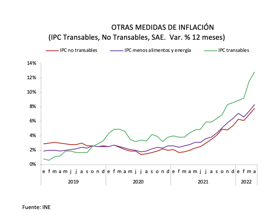 El índice de precios de los transables presentó una variación mensual positiva en abril de 1,8%, y los no transables, de 0,9% con respecto a marzo. En 12 meses, en tanto, se incrementaron 12,8% y 7,8%, respectivamente. Finalmente, se observa que el IPC sin alimentos ni energía (IPCSAE) registró una variación mensual de 1,0%, alcanzando una variación anual de 8,3%.
