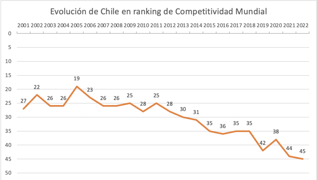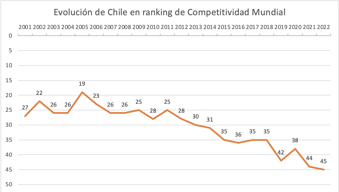 En la última versión del Ranking de Competitividad Mundial del IMD, nuestro país cae por segundo año consecutivo, ocupando el lugar número 45 dentro de 63 economías. En esta ocasión, Chile solo retrocede un lugar, aunque esto lo posiciona en su peor desempeño desde que se elabora el índice en 2001.