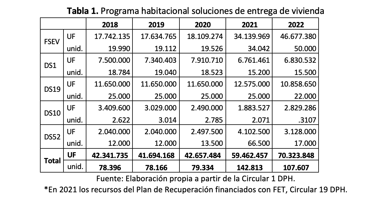 En la Tabla 1 se observa el presupuesto asignado al programa habitacional. El programa considera soluciones para la vivienda sin deuda (FSEV), con deuda (DS1), integración (DS19), rural (DS10) y arriendo (DS52). En 2022 el mayor número de soluciones proviene del programa de arriendo de emergencia implementado durante la pandemia. Si en 2020 se destinaron 13.500 subsidios para arriendo, en 2021 fueron 66.500 subsidios.