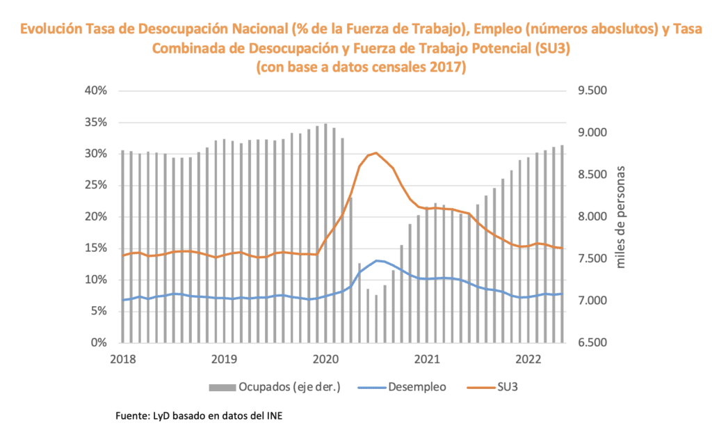 El Instituto Nacional de Estadísticas (INE) dio a conocer la tasa de desocupación nacional correspondiente al trimestre marzo - mayo 2022, la cual se ubicó en 7,8%, 0,1 puntos porcentuales (pp) menor a lo registrado el trimestre móvil anterior. En doce meses, en tanto, se observa una caída de 2,2 puntos porcentuales. Adicionalmente, se registró una leve caída en la tasa combinada de desocupación y fuerza de trabajo potencial (SU3) con respecto al trimestre móvil anterior, la que se ubicó en 15,1%. Este indicador muestra la proporción de personas que están desocupadas y aquellos que son parte de la fuerza de trabajo potencial, todo esto respecto de la fuerza de trabajo ampliada.