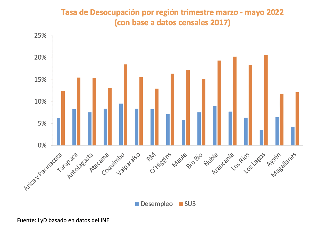 Coquimbo lidera la tasa de desempleo, con un registro de 9,6%, le sigue la Región de Ñuble con 9,0% y la Región de Atacama con una tasa de 8,4%. En contraste, las regiones con menor tasa de desempleo fueron Los Lagos con 3,6% y Magallanes que registró 4,3%.  La región de Los Lagos registra la mayor tasa combinada de desocupación y fuerza de trabajo potencial en este trimestre, anotando un 20,6%.