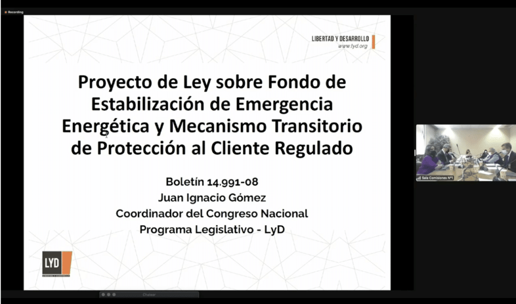 El abogado de LyD, Juan Ignacio Gómez, expuso en la Comisión de Minería y Energía de la Cámara del Senado sobre la estabilización de tarifas eléctricas.