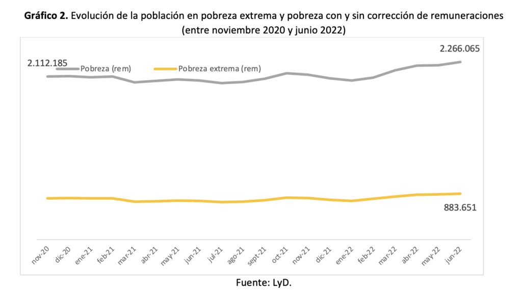 Para evaluar cuánto de esta alza de precios ha incidido en la pobreza, un ejercicio es suponer que los hogares están enfrentando un costo de la línea de la pobreza más restrictivo y que los ingresos del hogar fueron reajustados por el índice de remuneraciones (IR) de ese período. En ese caso, la pobreza aumentaría en 153.880 personas, de 2.112.185 a 2.266.065, de 10,8% a 11,6%. Mientras, que la pobreza extrema sube en 52.419 personas, de 831.232 a 883.651, pasando de 4,3% a 4,5%. Lamentablemente, puede darse el caso que los ingresos de estas familias desde noviembre 2020 no han aumentado, enfrentándose a mayores costos para cubrir sus necesidades básicas.