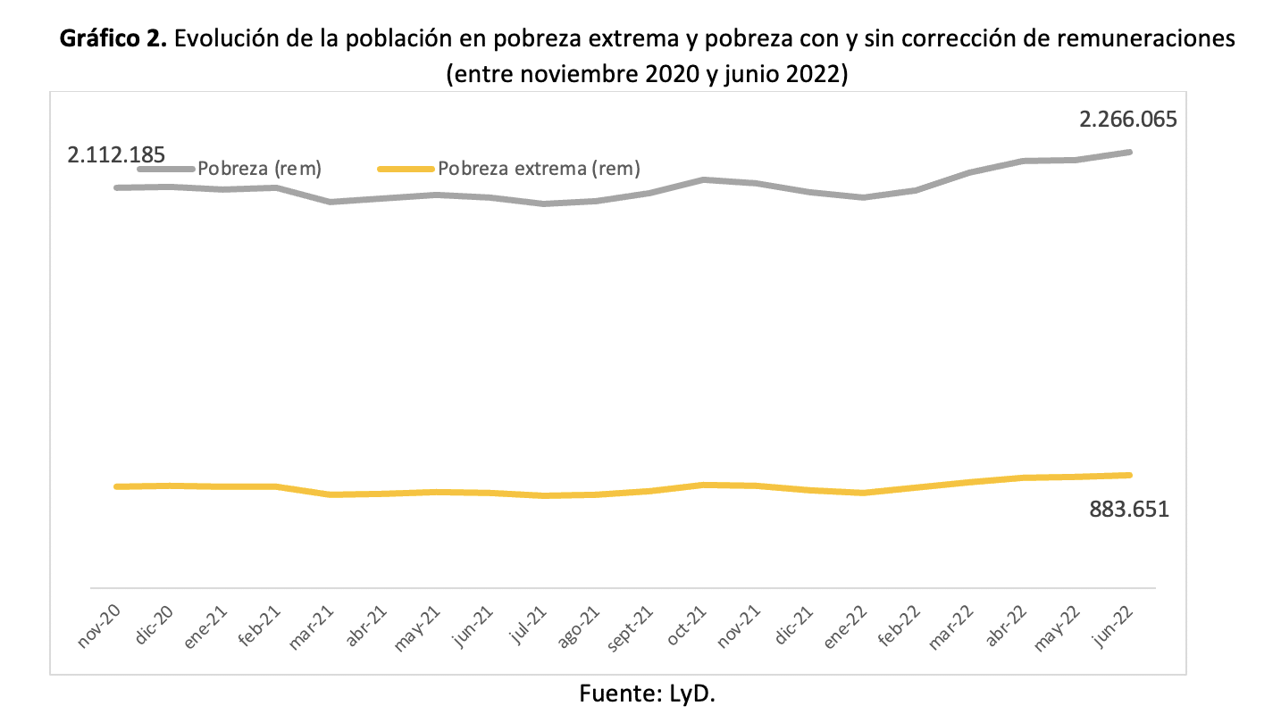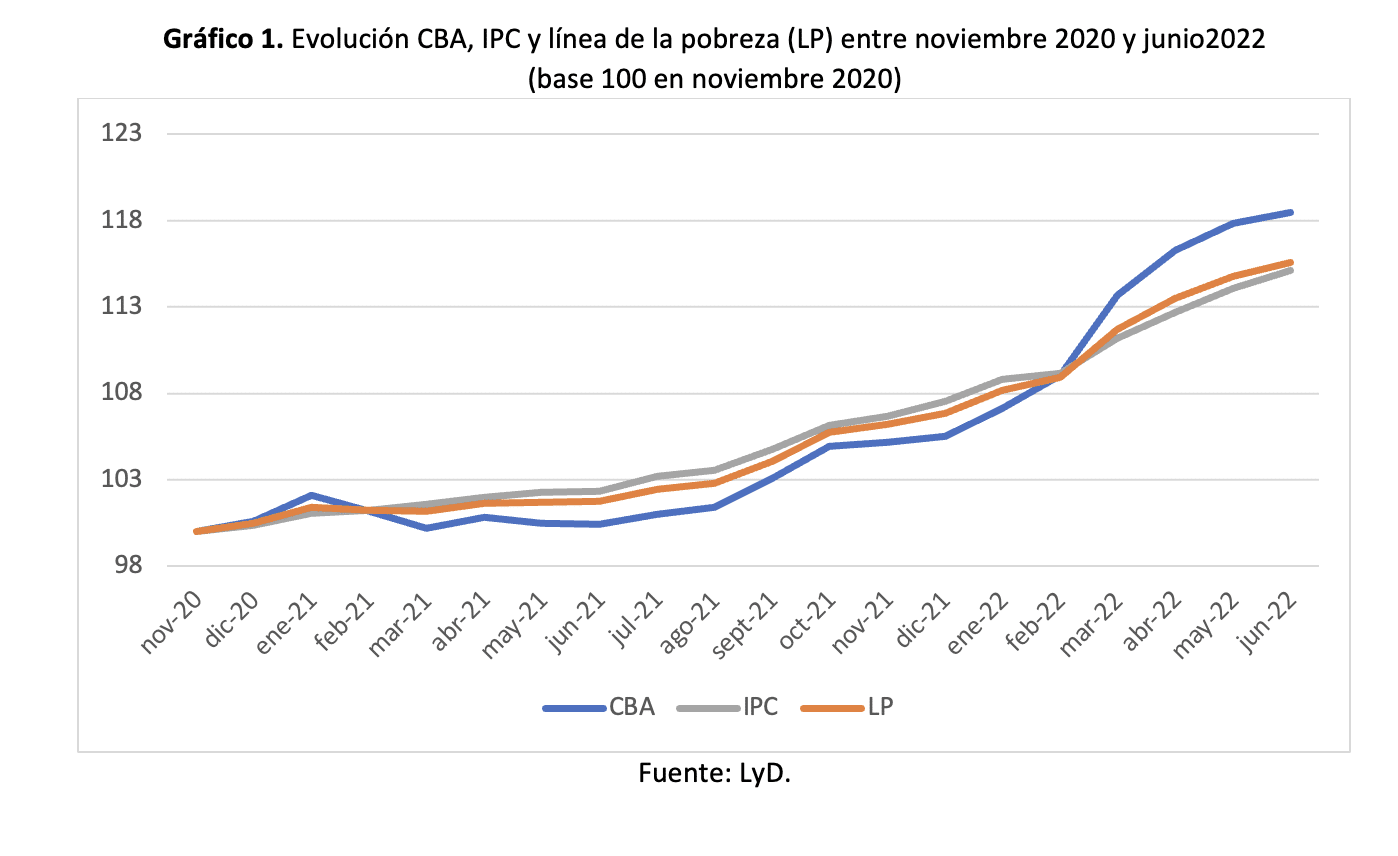 Se observa que, desde la última estimación oficial de la pobreza, el aumento de la CBA ha sido mayor que el Índice de Precios al Consumidor (IPC). El trabajo de campo de la encuesta Casen en Pandemia 2020 se concentró en noviembre 2020 y desde entonces la CBA ha aumentado un 18,5%, de $47.599 en noviembre 2020 a $56.386 en junio 2022, mientras que el umbral para ser considerado pobre subió un 15,6%, de $174.131 a $ 201.230 en ese mismo período y el IPC ha crecido un 15,1% (Ver Gráfico 1).