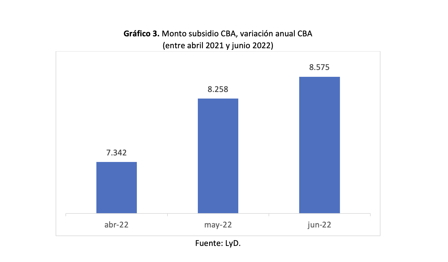 Dado el aumento de la inflación, la actual administración propuso como medida un aporte mensual compensatorio al que denominó subsidio por la CBA que se comenzó a pagar mensualmente desde abril de 2022. El valor del aporte depende de la diferencia en el valor de la CBA con el año anterior. En el Gráfico 3 se muestra como en junio es de $8.575 mil por personas, es decir, en una familia de cuatro personas este aporte supera los $34 mil pesos.