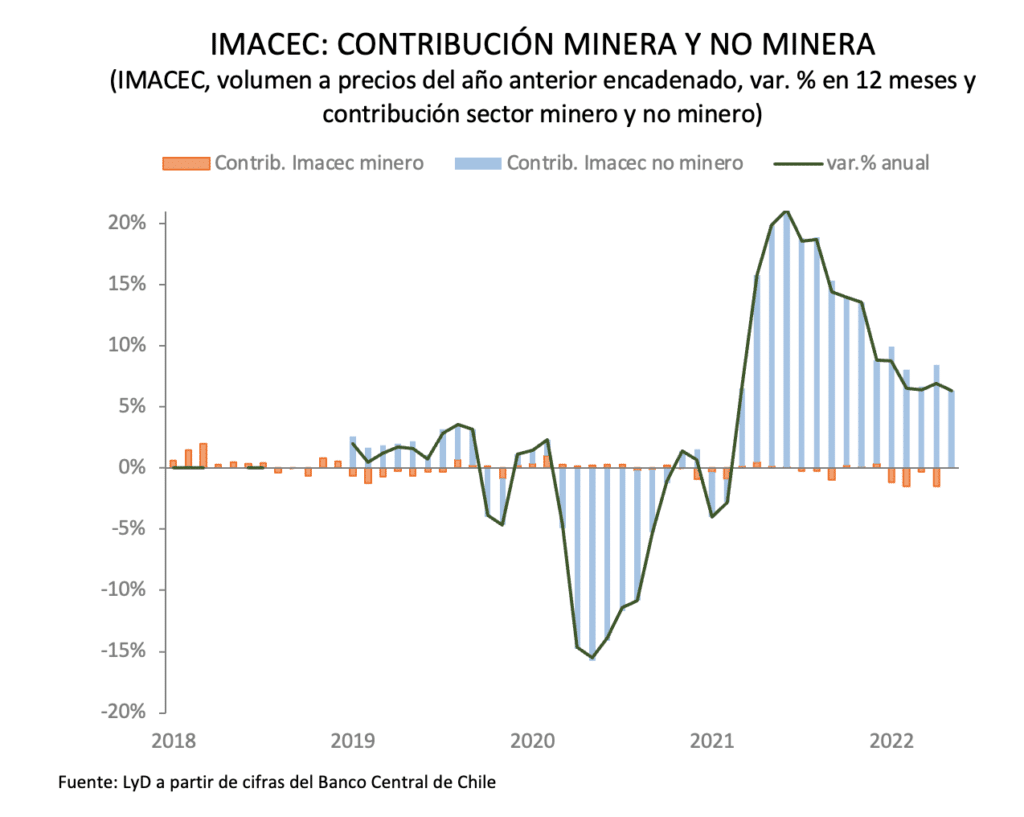 Si desagregamos el IMACEC entre minero y no minero, se tiene que el primero cayó 0,1%. El IMACEC no minero, en tanto, creció 7,4%. Corrigiendo por estacionalidad, con respecto a abril, se tiene que el IMACEC minero creció 5,1%, y el no minero cayó 0,9%. De esta manera, el sector minero no contribuyó a la variación anual del IMACEC de mayo de 2022, mientras que la actividad no minera contribuyó 6,4%, explicado por el desempeño de los servicios.