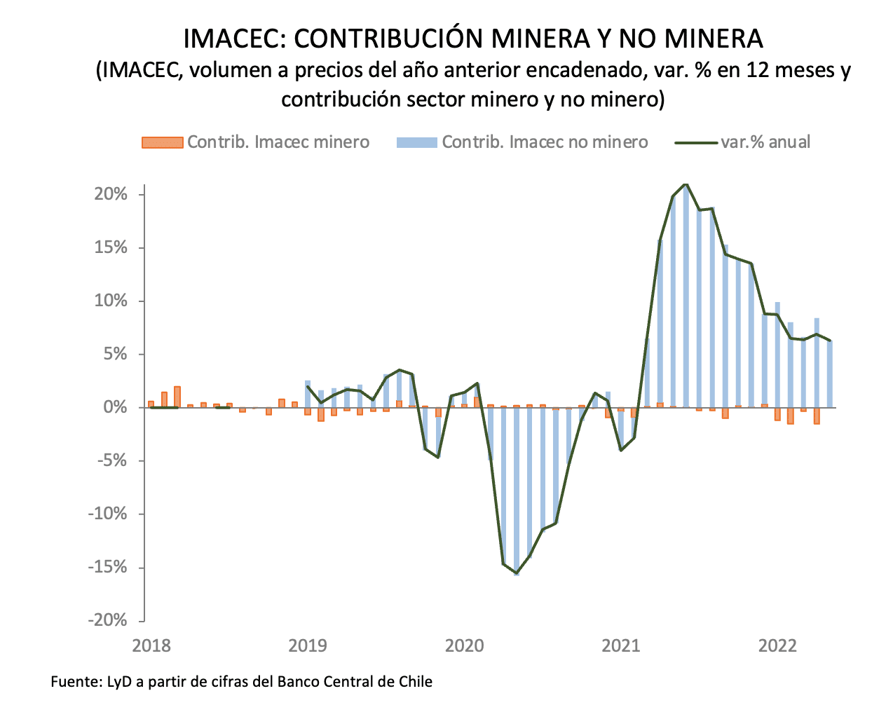 El Banco Central de Chile dio a conocer el IMACEC de mayo de 2022 que registró una expansión de 6,4% en comparación con igual mes del año anterior. Este resultado se encuentra sobre lo esperado por el mercado.