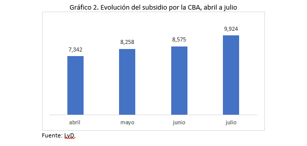 Dado el aumento de la inflación, la actual administración propuso como medida un aporte mensual compensatorio al que denominó subsidio por la CBA que se comenzó a pagar mensualmente desde abril de 2022. El valor del aporte depende de la diferencia en el valor de la CBA con el año anterior. En el Gráfico 2 se muestra como en junio es de $9.924 mil por personas, es decir, en una familia de cuatro personas este aporte llega casi a los $40 mil.