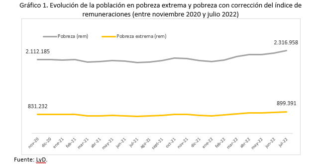 Se observa que, desde la última estimación oficial de la pobreza, el aumento de la CBA ha sido mayor que el Índice de Precios al Consumidor (IPC). El trabajo de campo de la encuesta Casen en Pandemia 2020 se concentró en noviembre 2020 y desde entonces la CBA ha aumentado un 21,9%, de $47.599 en noviembre 2020 a $58.003 en julio 2022, mientras que el umbral para ser considerado pobre subió un 17,8%, de $174.131 a $ 205.176 en ese mismo período y el IPC ha crecido un 16,7%.