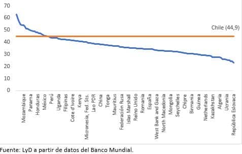 En el primer discurso ante el plenario de las Naciones Unidas, el Presidente Gabriel Boric se refirió a Chile como uno de los países más desiguales del mundo. Si se utiliza el último valor disponible, se observa que si bien Chile está sobre la media no es el país más desigual del mundo. De hecho, se encuentra en una mejor situación que varios países de la región según el Banco Mundial (Gráfico 1). Colombia tiene un coeficiente de Gini de 54,2 (mayor el número es más desigual), Panamá (49,8), Costa Rica (49,3), Brasil (48,9), Guatemala (48,3), Honduras (48,2), Ecuador (47,3), Nicaragua (46,2), México (45,4), mientras Chile un 44,9. A partir de la misma fuente de información entre los años 2007 y 2017 había logrado reducir la desigualdad en casi 3 puntos.