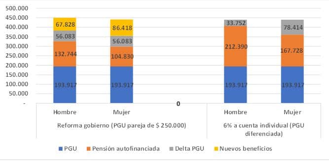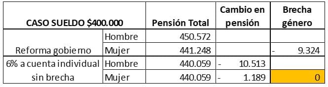 La siguiente tabla muestra el caso presentado por el gobierno de una persona que tiene un sueldo de $ 400.000, quien bajo la reforma del gobierno recibiría una pensión de $ 450.572 si es hombre y $ 441.248 en el caso si es mujer. El incremento respecto de las pensiones actuales ($ 326.661 y $ 298.747 respectivamente sin reforma) se debe al aumento de la PGU a $ 250.000 para mujeres y hombres y a los nuevos beneficios que entregaría la reforma. En cuanto a la brecha entre las pensiones de mujeres y hombres, esta se ubica en $ 9.324.