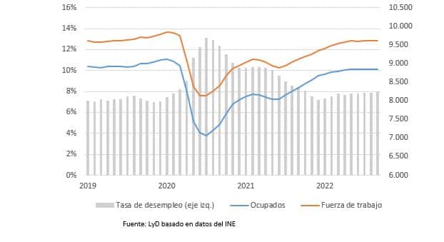 El Instituto Nacional de Estadísticas (INE) dio a conocer la tasa de desocupación nacional correspondiente al trimestre julio-septiembre 2022, la cual se ubicó en 8,0%, creciendo 0,1 pp. respecto al trimestre móvil anterior. En doce meses, en tanto, se observa una caída de 0,4 pp, debido a que el aumento en la Fuerza de Trabajo (5,5%), fue menor al crecimiento en los Ocupados (6,0%). Los desocupados, en tanto, aumentaron 1,0%.