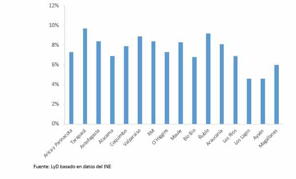 Al igual que el trimestre anterior, Tarapacá lidera la tasa de desempleo, con un registro de 9,7%, le sigue la Región de Ñuble y Atacama, con una tasa de 9,2% y 8,4%, respectivamente. En contraste, las regiones con menor tasa de desempleo fueron Los Lagos y Aysén, ambos con un registro de 4,6%. La tasa de desempleo disminuyó en 6 regiones, aumentó en 8 y se mantuvo en 2.