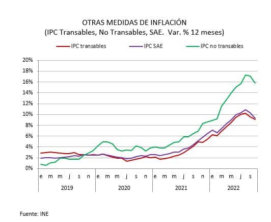Si bien el índice de precios de los transables y el de no transables presentaron variaciones mensuales positivas en octubre (0,2% y 0,9% respectivamente), en 12 meses, comienzan a moderar su incremento, registrando 15,8% y 9,1%, respectivamente. Lo mismo ocurre con el IPC sin alimentos, ni energía (IPCSAE) que registró una variación mensual de 0,4%, alcanzando una variación anual de 9,3%, menor a la registrada en septiembre (10,3%).