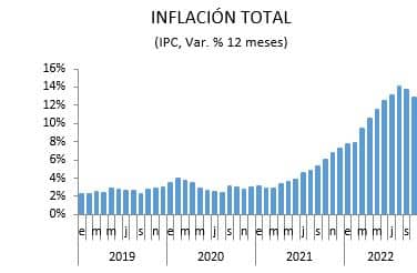 El Instituto Nacional de Estadísticas (INE) dio a conocer el Índice de Precios al Consumidor (IPC) para el mes de octubre de 2022, el cual registró una variación mensual de 0,5%, menor a lo esperado por el mercado, acumulando 11,4% en lo que va del año. En doce meses, la inflación total alcanzó una variación de 12,8%, cediendo por segunda vez consecutiva en el año, luego de haber alcanzado el posible peak en agosto (14,1%).