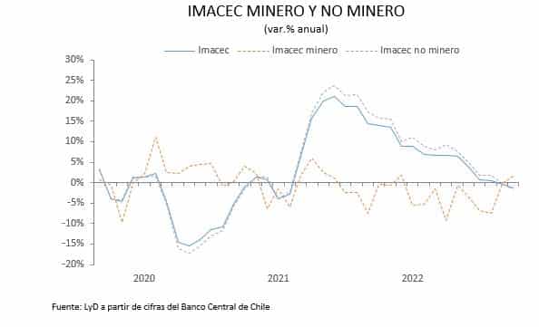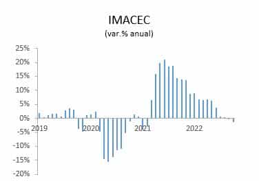 El Banco Central de Chile dio a conocer el IMACEC de octubre de 2022 que cayó 1,2% en comparación con igual mes del año anterior. Este resultado corresponde al menor registrado desde febrero del año pasado y se encuentra por debajo de lo esperado por el mercado. La serie desestacionalizada, por su parte, aumentó 0,5% respecto al mes previo y cayó 0,8% en doce meses. El mes registró un día hábil menos que octubre de 2021.