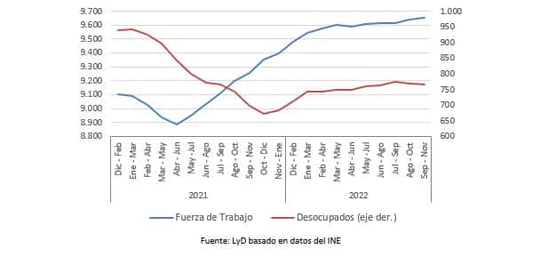 El Instituto Nacional de Estadísticas (INE) dio a conocer la tasa de desocupación nacional correspondiente al trimestre septiembre-noviembre 2022, la cual se ubicó en 7,9%. Si bien esta cifra muestra una caída de 0,1 pp. respecto al trimestre móvil anterior, esto se debió principalmente al aumento del empleo agrícola (3,3%), típico de esta época, y en menor medida, del comercio, que creció 2% con respecto a agosto-octubre 2022. Esto mientras los demás sectores continúan a la baja en línea con la recesión económica.