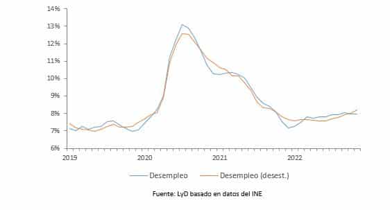 Dado que históricamente la tasa de desempleo cae a fin de año, conviene analizar los datos desestacionalizados. De esta forma, la tasa de desempleo subió 0,2 pp. ubicándose en 8,2% como se observa en el Gráfico N°2. Además, en este último trimestre se destruyeron más de 17 mil empleos, con respecto a agosto-octubre 2022, por lo que a 2022 ya contamos con 50 mil puestos de trabajo menos.