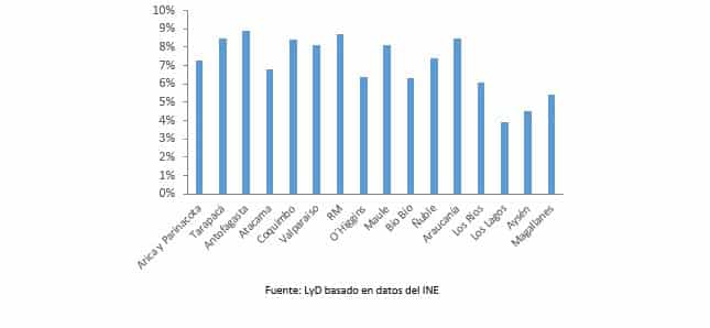 En este trimestre pudimos ver un aumento del desempleo en 6 regiones y una reducción en 9, mientras que en una región se mantuvo. Nuevamente Antofagasta lidera la tasa de desempleo, con un registro de 8,9%, le sigue la Región Metropolitana (8,7%) y la Araucanía (8,5%). En contraste, las regiones con menor tasa de desempleo fueron Los Lagos y Aysen, con registros de 3,9% y 4,5%, respectivamente.
