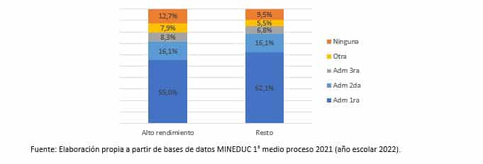Más aún, al ahondar en los resultados de las postulaciones, se encuentra que hay un grupo que se está viendo especialmente perjudicado, en la medida que queda sistemáticamente con una menor frecuencia que el resto en el colegio de su preferencia. Se trata de los estudiantes que son calificados por el propio sistema como de alto rendimiento académico, por provenir del 20% superior de notas de su colegio de origen. Para el proceso 2021, éstos representaron un 39,2% del total de postulantes a 1° medio, lo que da cuenta de una sobrerrepresentación que además sugiere una mayor motivación por cambiarse de colegio y recibir una formación académica acorde a sus intereses.